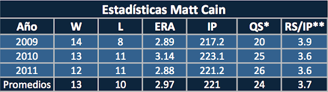 Fijense que en los últimos años tiene numero muy consistentes, con promedio de 2.97 de Efectividad y 221 innings lanzados, acumulando 200 o más innings desde el 2007 y ocupa el 5to lugar con 114 QS desde el 2007 a la fecha. Las estadísticas que no le favorecen son los ganados y perdidos, promediando un 13-10, pero esto es causado a la falta de apoyo de carreras de los Giants, los cuales poseen un RS/IP de 3.7 en los últimos 3 años de Cain, mientras el de la MLB es de 4.6 carreras.